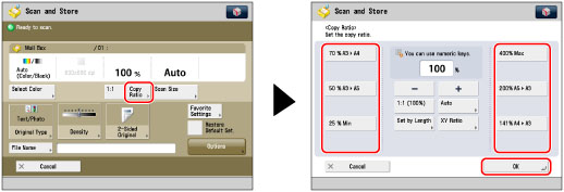 Press [Copy Ratio] → adjust the zoom ratio using [-] and [+] → press [OK].
