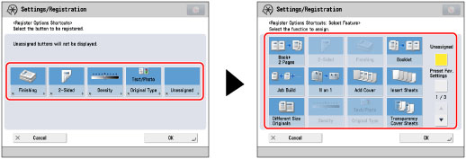 You can register modes in the shortcut keys displayed on the Copy screen. You can register up to five desired buttons from [Options] and [Favorite Settings].