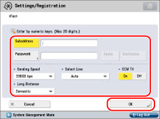 Press [Set Details] to set the subaddress, password, ECM TX, Sending Speed, and Long Distance. If the machine is set to use multiple lines, you can also select the line to use when sending.