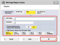 If you select [Use (Security Auth.)] for <Authentication Information>, and the [Date/Time Settings] in [Preferences] (Settings/Registration) are different from the time settings on the LDAP server, the machine may not be able to connect to the LDAP server.