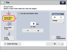 You can only set the Erase Original Frame mode for the original sizes shown on the touch panel display.