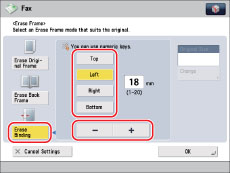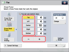 Press [Erase Binding] → specify the location of the binding marks → press [-] or [+] to set the erase frame width.