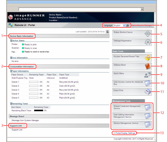 The screen below, which appears when you start your Web browser and log in to the Remote UI, is called the Portal page.
