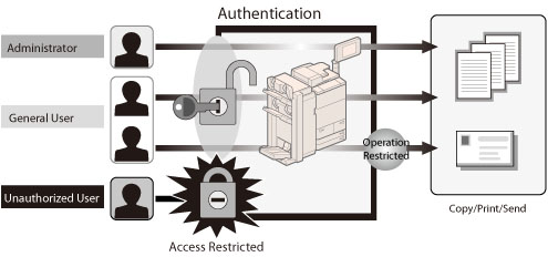 The authentication on this machine requests user information (user name and password) when users access the machine, and verifies that information. Only an authorized user that has successfully passed the authentication can operate the machine. You can prevent access by unauthorized users by managing the users for the machine. To use the authentication mode, you must first register the information for administrators and general users.