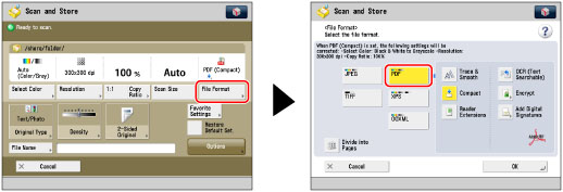 If you select [Trace & Smooth] as the PDF file format, [Compact] is automatically set to 'On'. You can also set [OCR (Text Searchable)]. [Trace & Smooth] cannot be set by itself.