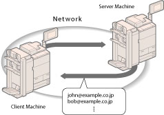 The machine can access a server machine on the network as a client machine to search for/specify destinations from the Address Book of the server machine.