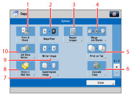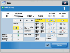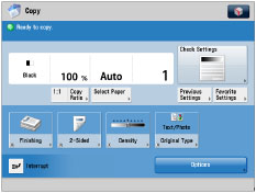 Press to select a [Options] mode. [Finishing], [2-Sided], [Density], and [Original Type] are set as default. |