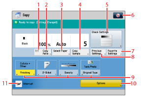 You can perform the same operations on both the Regular Copy Basic Features screen and the Express Copy Basic Features screen. Set which screen to display from the Settings/Registration screen. (See "Switching the Copy Basic Features Screen.")