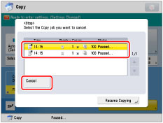 If you press [Cancel] on the pop-up screen that appears while the machine is copying or waiting to copy, you can cancel the job that is copying or the last job that you scanned an original for that is waiting to copy.