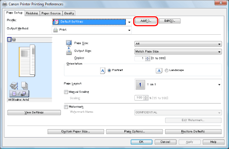 To edit or delete a profile, in the printer driver screen, click [Edit] at the right of [Profile]. However, pre-defined profiles cannot be modified.