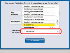 Les noms des domaines et de serveur du serveur LDAP permettant l'authentification utilisateur sont affichés sur la liste déroulante <Destination de connexion>.
