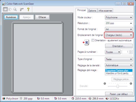 Dans la feuille [Principal] → sélectionner [Vitre d'exposition] pour l'option [Emplacement de l'original].
