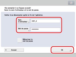 Si le service de connexion SSO-H est utilisé, il est possible d'appuyer sur [Mémoriser le mot de passe] pour mémoriser le nom d'utilisateur et le mot de passe. Lors de la prochaine connexion à l'Espace avancé, le nom d'utilisateur et le mot de passe seront saisis automatiquement et l'écran de sélection des espaces mémoire s'affichera en appuyant simplement sur [OK]. Cette opération n'est pas nécessaire si l'écran de connexion ne s'affiche pas.