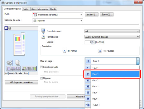 Sur la feuille [Configuration page], sélectionner [2 sur 1] sous [Mise en page].