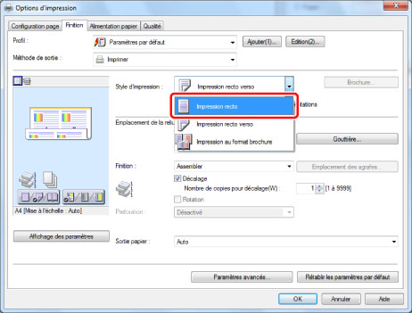 Dans la feuille [Finition], sélectionner [Impression recto] sous [Style d'impression].