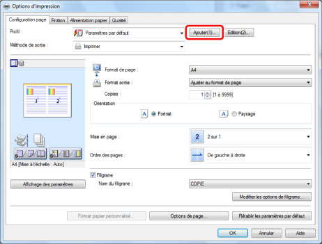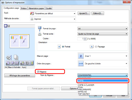 Cette section décrit la procédure de mémorisation des réglages de l'impression de deux pages sur une seule feuille (2 sur 1) avec un filigrane annoté "COPIE" et de sélection du profil mémorisé pour effectuer l'impression.