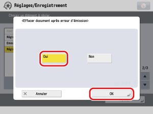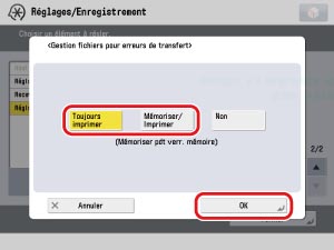 → [Réglages de fonction] → [Recevoir/Transférer] → [Réglages communs] → [Gestion fichiers pour erreurs de transfert] → sélectionner [Mémoriser/Imprimer] ou [Toujours imprimer] → appuyer sur [OK].