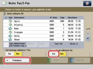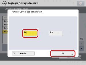 Appuyer sur [Oui] pour <Verrouillage mémoire fax> → [Précédent].