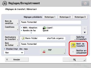 On peut définir d'envoyer une notification par e-mail uniquement lorsqu'une erreur de transfert est détectée. Sélectionner une condition de transfert → appuyer sur [Détails/Modif.] → sélectionner [Notif. de transfert] et [Notifier err. uniquement].