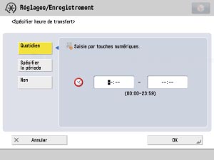 Il est possible de valider/d'invalider des réglages de transfert en fonction du jour ou de l'heure en sélectionnant [Spécifier H.transfert]. Par exemple, on peut invalider le transfert pendant les heures auxquelles l'ordinateur est éteint (la nuit, le week-end ou les jours fériés par exemple).
