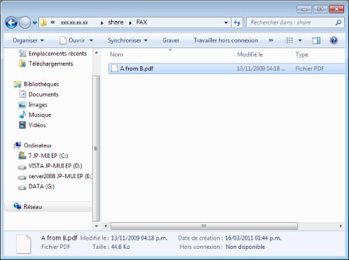 Cette section présente la procédure d'envoi de télécopies reçues vers l'espace partagé dans l'espace avancé qui est ouvert au public par SMB et la procédure d'impression des documents sur une imprimante de proximité.