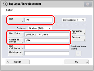 Dérouler la liste Protocole → sélectionner le protocole d'envoi [Windows (SMB)] → saisir le [Nom], le [Nom d'hôte] et le [Chemin du dossier] du dossier réservé aux documents envoyés par fax que vous avez créé dans l'Espace avancé.