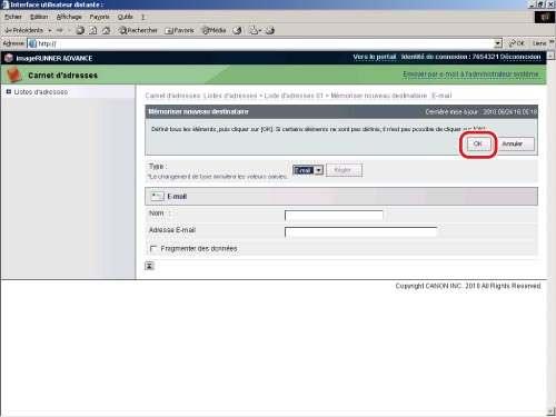 Une adresse e-mail peut être enregistrée efficacement de l'interface utilisateur distante.