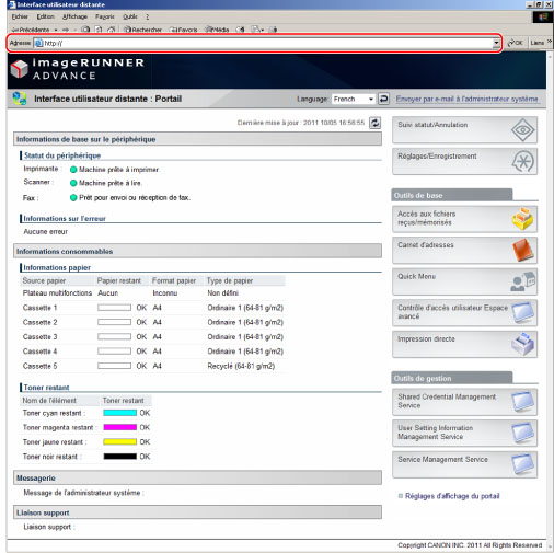 Démarrer un navigateur Web → saisir l'adresse IP de la machine dans [Adresse].