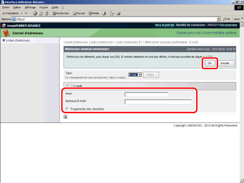 Adresse e-mail acquise pour la machine imageRUNNER ADVANCE