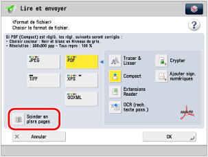 Si [PDF], [XPS], [TIFF] ou [OOXML] est sélectionné, utiliser le mode Scinder en plsrs pages.