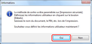 Cliquer sur [Oui] dans la boîte de dialogue pour définir les informations utilisateur du mode Impression sécurisée.