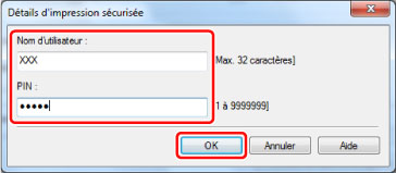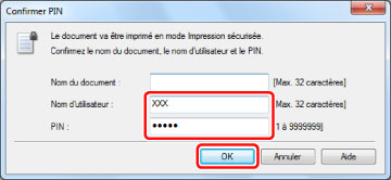 Saisir le nom du document, le nom d'utilisateur et le mot de passe dans la boîte de dialogue [Impr. sécurisée] → cliquer sur [OK].