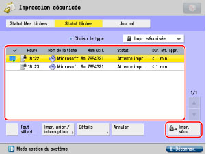 Un symbole de verrouillage s'affiche à gauche du numéro de la tâche d'impression sécurisée.
