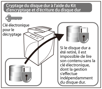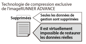 L'accès aux données réelles se trouvant sur le disque dur de la machine est impossible depuis l'écran de la machine ou un ordinateur du réseau. En outre, l'analyse du disque dur de la machine après son retrait est quasiment impossible puisqu'il faudrait analyser le microprogramme imageRUNNER ADVANCE confidentiel de Canon ainsi que la technologie de la compression des données.