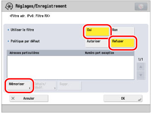Appuyer sur [Oui] pour <Utiliser le filtre> → appuyer sur [Refuser] pour <Politique par défaut> → appuyer sur [Mémoriser].