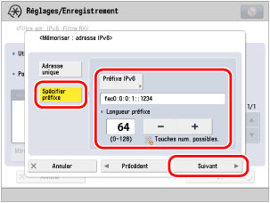 Appuyer sur [Spécifier préfixe] → saisir "fec0:0:0:1::1234" dans le champ [Préfixe IPv6] → "64" sous [Longueur préfixe] → appuyer sur [Suivant].