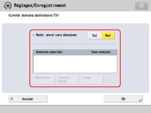 Il est possible de limiter le domaine auquel est envoyé l'e-mail. On peut empêcher toute fuite d'informations en autorisant l'envoi d'e-mails uniquement à une adresse électronique associée au domaine indiqué. Suivre les procédures ci-après pour définir le domaine du destinataire TX.