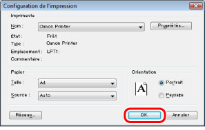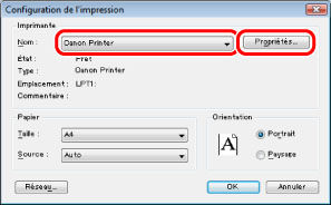 Sélectionner [Imprimer] dans le menu [Fichier] de l'application à partir de laquelle le fichier (tâche) est imprimé → sélectionner l'imprimante puis cliquer sur [Propriétés] dans la boîte de dialogue [Impression].