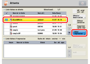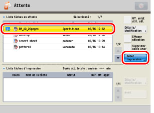 Sélectionner les tâches dans l'ordre d'impression sur l'écran Liste tâches en attente → appuyer sur [Démarrer l'impression].