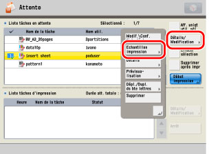 Sélectionner la tâche souhaitée sur la Liste tâches en attente → appuyer sur [Détails/Modification] → [Echantillon impression].