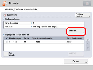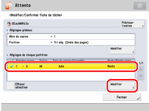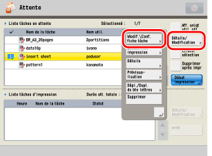 Sélectionner la tâche pour laquelle un type de papier a été modifié à l'étape précédente → appuyer sur [Détails/Modification] → [<Modifier/Confirmer fiche de tâche>].