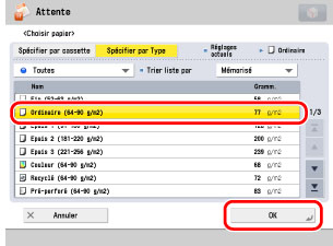 Sélectionner le type de papier à utiliser sur la liste → appuyer sur [OK].