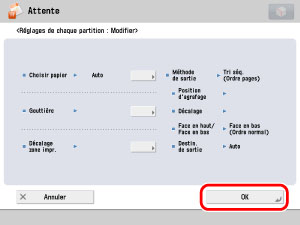 Sélectionner la tâche pour laquelle les réglages ont été indiqués aux étapes ci-dessus → appuyer sur [Démarrer l'impr.].