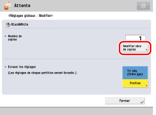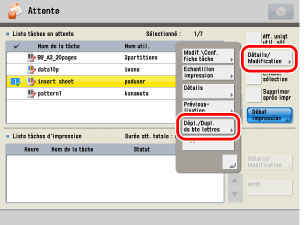Sélectionner la tâche pour laquelle un nombre de copies a été modifié à l'étape précédente → appuyer sur [Détails/Modification] → [Dépl./Dupl. ds bte lettres].