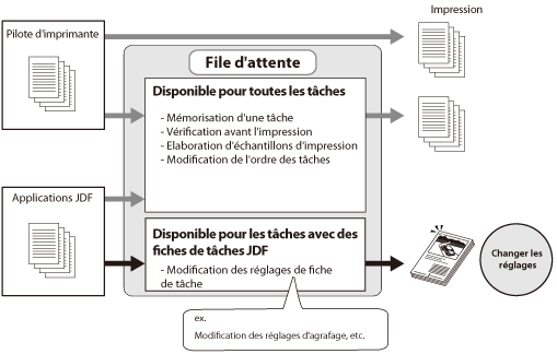 Mémorise la tâche envoyée en file d'attente. Lorsqu'une tâche est conservée en file d'attente, son impression peut être lancée sur la Liste tâches en attente. L'ordre des tâches en attente est modifiable. Si la tâche possède la fiche de tâche JDF, les réglages de finition peuvent être vérifiés et, le cas échéant, modifiés avant l'impression.