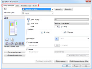 Cliquer sur les onglets [Configuration page], [Finition], [Source papier] et [Qualité] pour définir les réglages nécessaires.