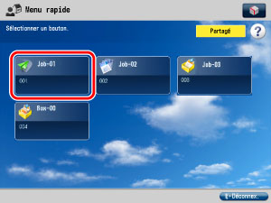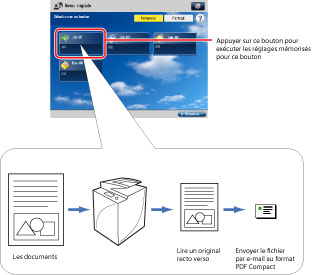 Le menu rapide est une fonction qui accélère l'usage des fonctions de la machine dans un bureau. Il est possible de créer et de mémoriser une série des fonctions les plus fréquemment utilisées telles que Copier, Lire et envoyer et Lire et mémoriser dans une seule touche.
