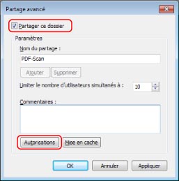 Sous Windows Vista/Windows 7, cliquer avec le bouton droit sur le dossier "PDF-Scan" → sélectionner [Propriétés] pour afficher la boîte de dialogue [Propriétés de: PDF-Scan] → cliquer sur l'onglet [Partage] → cliquer sur [Partage avancé] → sélectionner [Partager ce dossier] → cliquer sur [Autorisations].
