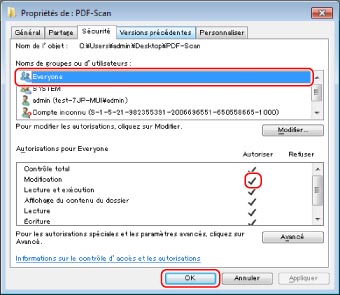 Sélectionner [Everyone] → vérifier que [Autoriser] est sélectionné pour [Modifier] → cliquer sur [OK]. Si l'option [Autoriser] n'est pas sélectionnée, sélectionner [Autoriser] → cliquer sur [OK].