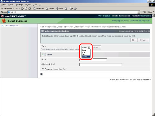 Une adresse e-mail peut être enregistrée efficacement de l'interface utilisateur distante.